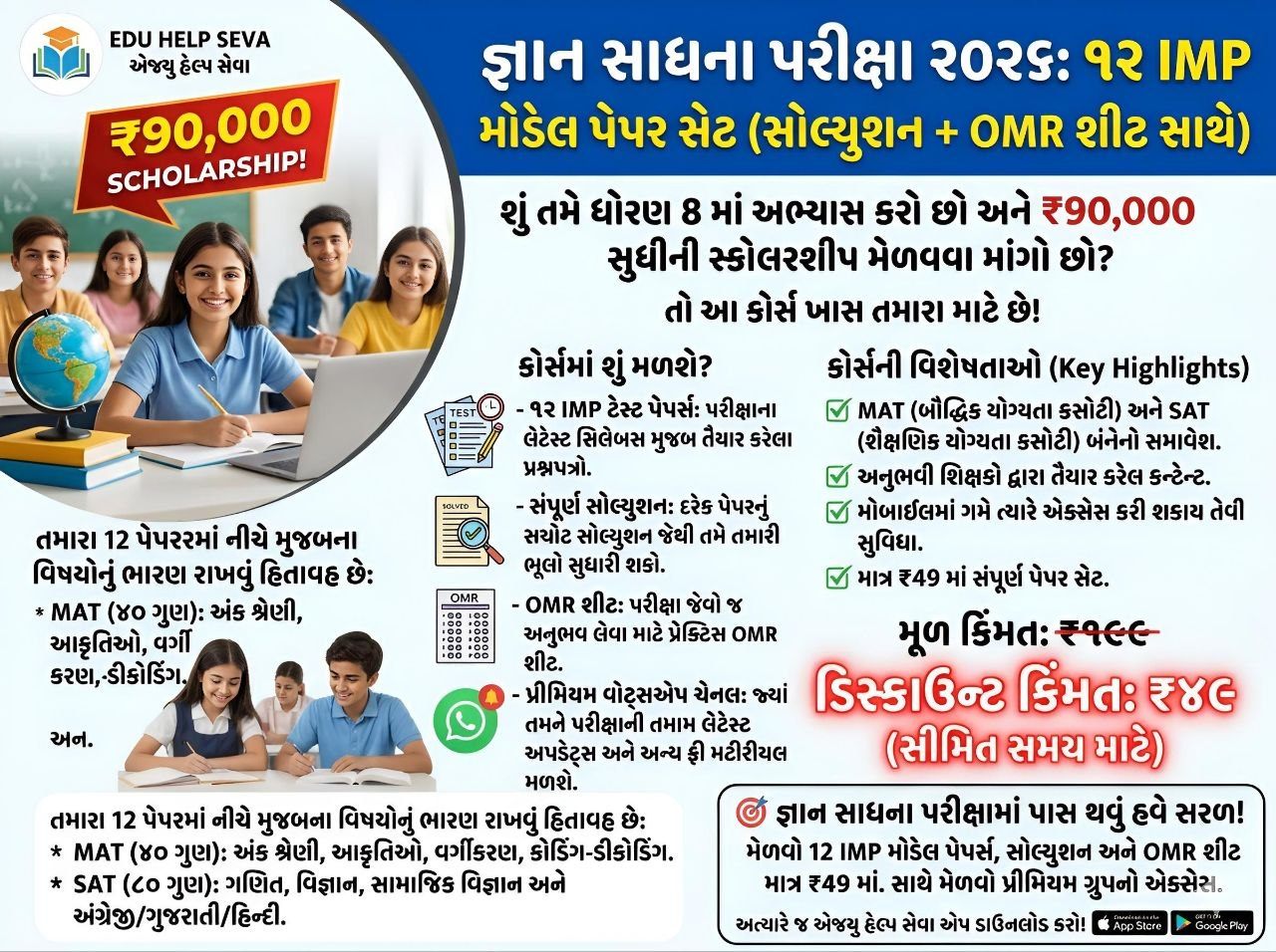 જ્ઞાનસાધના પરીક્ષા 2026 : 12 IMP મોડેલ પેપર સેટ (સોલ્યુશન + OMR શીટ સાથે) શું તમે ધોરણ 8 માં અભ્યાસ કરો છો અને ₹90,000 સુધીની સ્કોલરશીપ મેળવવા માંગો છો? તો આ કોર્સ ખાસ તમારા માટે છે! આ સ્પેશિયલ કોર્સમાં તમને જ્ઞાન સાધના પરીક્ષાની સંપૂર્ણ તૈયારી માટેનું બેસ્ટ મટીરીયલ મળશે. કોર્સમાં શું મળશે? 12 IMP ટેસ્ટ પેપર્સ: પરીક્ષાના લેટેસ્ટ સિલેબસ મુજબ તૈયાર કરેલા પ્રશ્નપત્રો. સંપૂર્ણ સોલ્યુશન: દરેક પેપરનું સચોટ સોલ્યુશન જેથી તમે તમારી ભૂલો સુધારી શકો. OMR શીટ: પરીક્ષા જેવો જ અનુભવ લેવા માટે પ્રેક્ટિસ OMR શીટ. પ્રીમિયમ વોટ્સએપ ચેનલ: જ્યાં તમને પરીક્ષાની તમામ લેટેસ્ટ અપડેટ્સ અને અન્ય ફ્રી મટીરીયલ મળશે. કોર્સની વિશેષતાઓ (Key Highlights) ✅ MAT (બૌદ્ધિક યોગ્યતા કસોટી) અને SAT (શૈક્ષણિક યોગ્યતા કસોટી) બંનેનો સમાવેશ. ✅ અનુભવી શિક્ષકો દ્વારા તૈયાર કરેલ કન્ટેન્ટ. ✅ મોબાઈલમાં ગમે ત્યારે એક્સેસ કરી શકાય તેવી સુવિધા. ✅ માત્ર ₹49 માં સંપૂર્ણ પેપર સેટ. ભાવ (Pricing structure) મૂળ કિંમત: ₹199 ડિસ્કાઉન્ટ કિંમત: ₹49 (સીમિત સમય માટે) 🎯 જ્ઞાન સાધના પરીક્ષામાં પાસ થવું હવે સરળ! મેળવો ૧૨ IMP મોડેલ પેપર્સ, સોલ્યુશન અને OMR શીટ માત્ર ₹49 માં. સાથે મેળવો પ્રીમિયમ ગ્રુપનો એક્સેસ. અત્યારે જ એજ્યુ હેલ્પ સેવા એપ ડાઉનલોડ કરો! 120 MARK :- MAT (40 ગુણ): અંક શ્રેણી, આકૃતિઓ, વર્ગીકરણ, કોડિંગ-ડીકોડિંગ. SAT (80 ગુણ): ગણિત, વિજ્ઞાન, સામાજિક વિજ્ઞાન અને અંગ્રેજી/ગુજરાતી/હિન્દી.